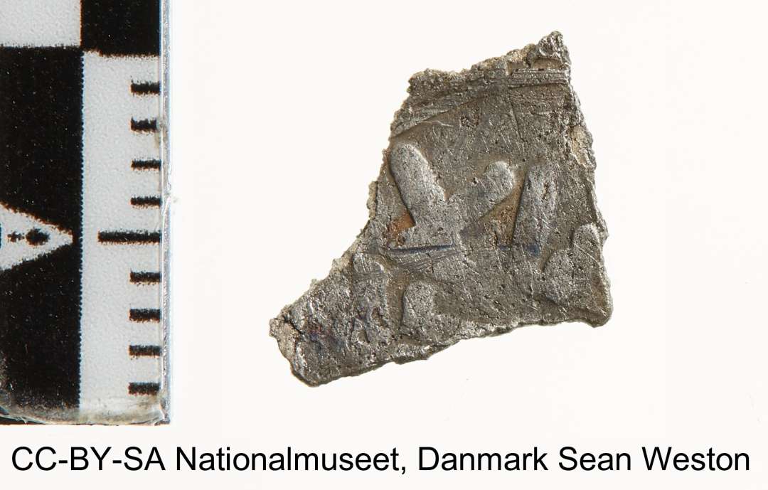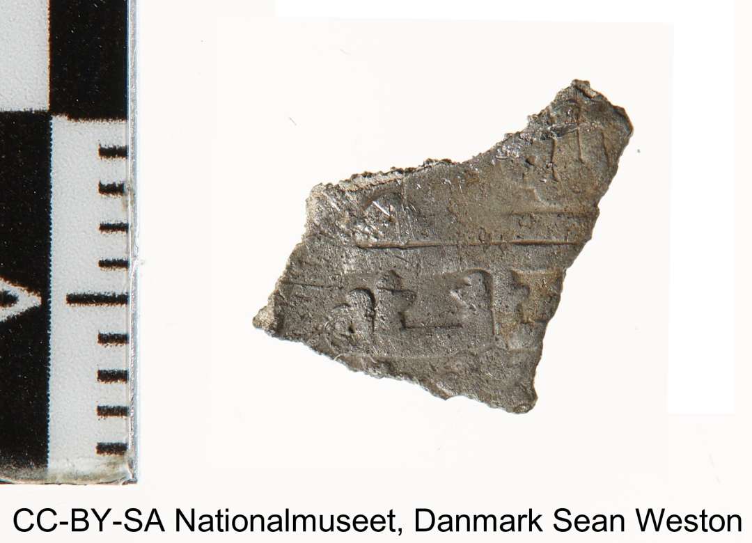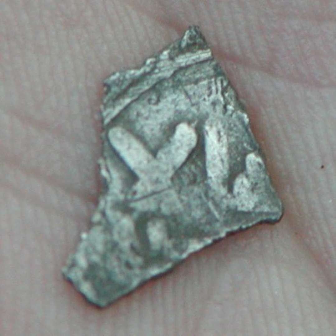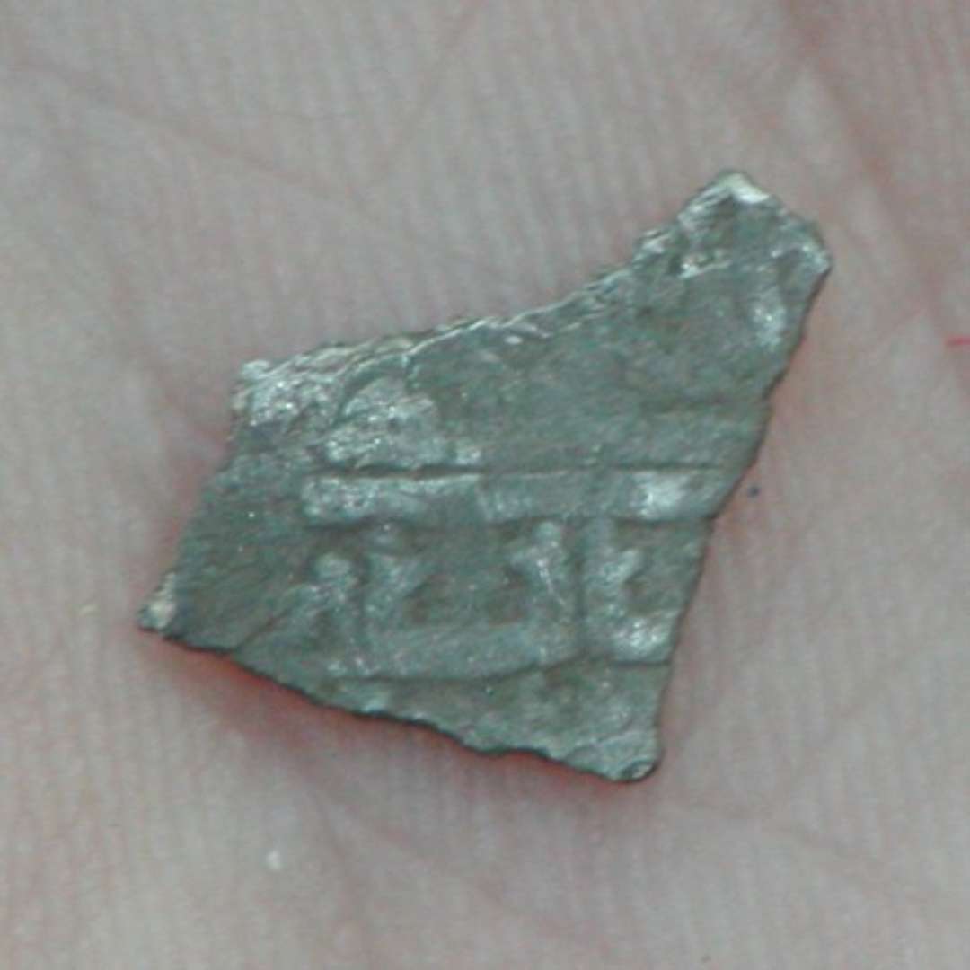 Lille fragment af dirhem med tydelige skrifttegn på begge sider. Største mål ca. 11 x 8 mm. Dirhem.