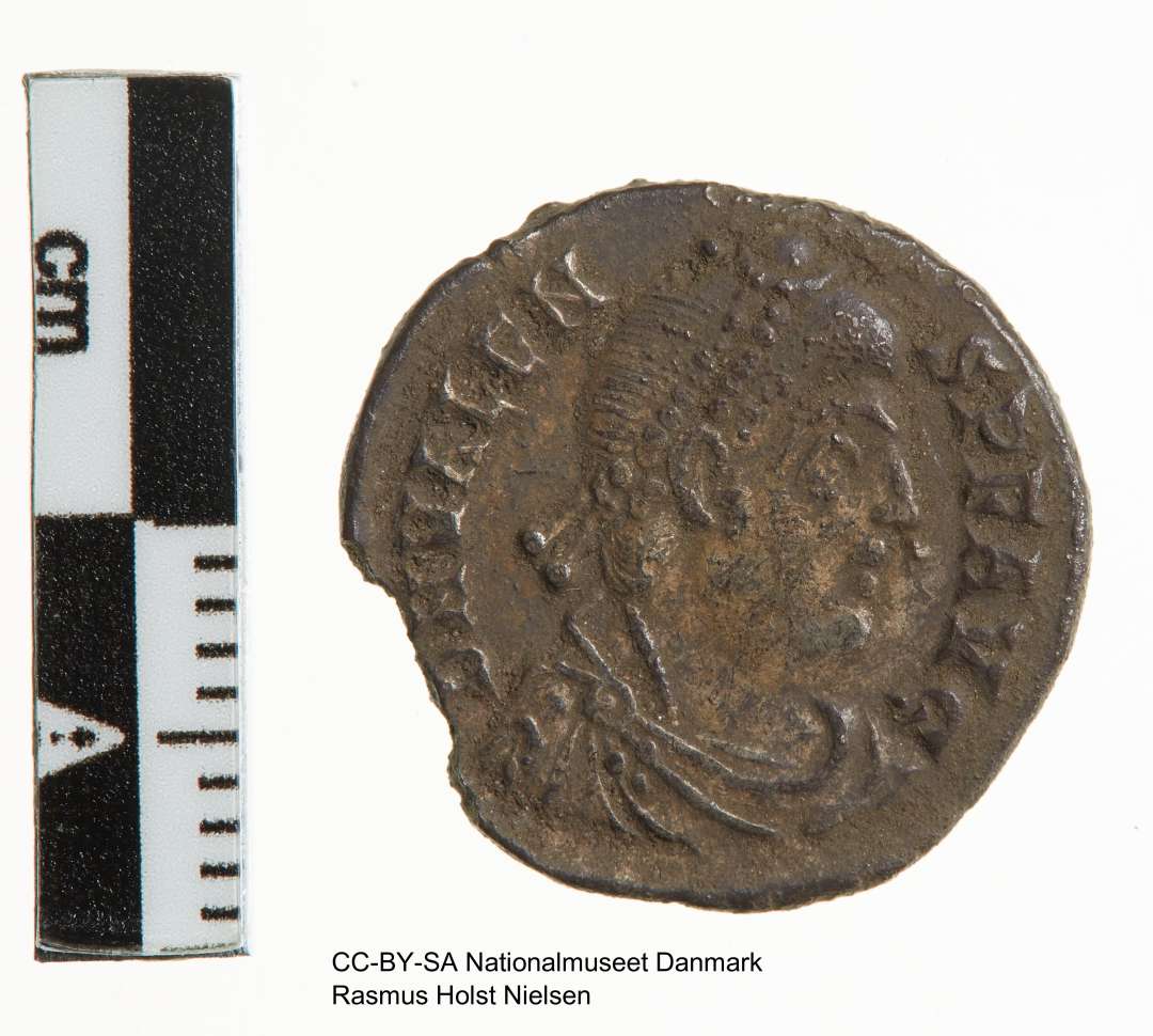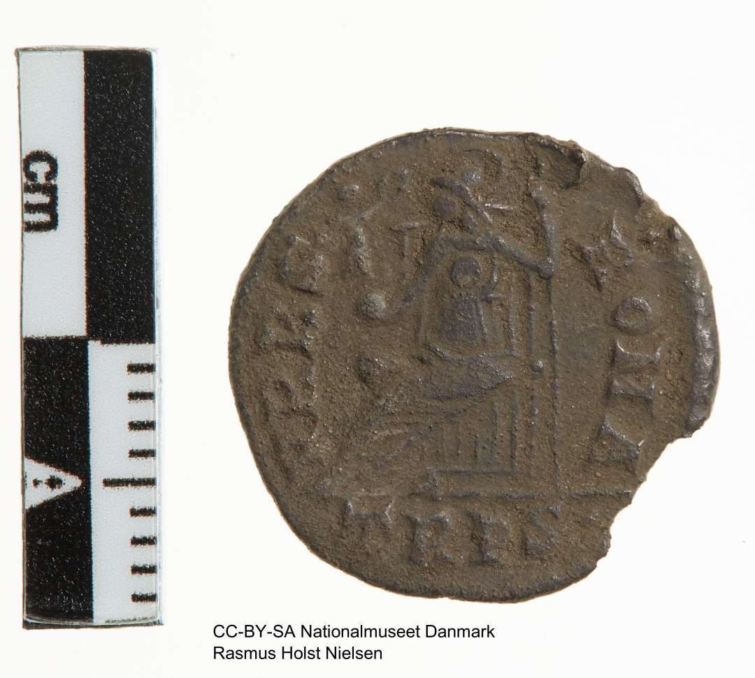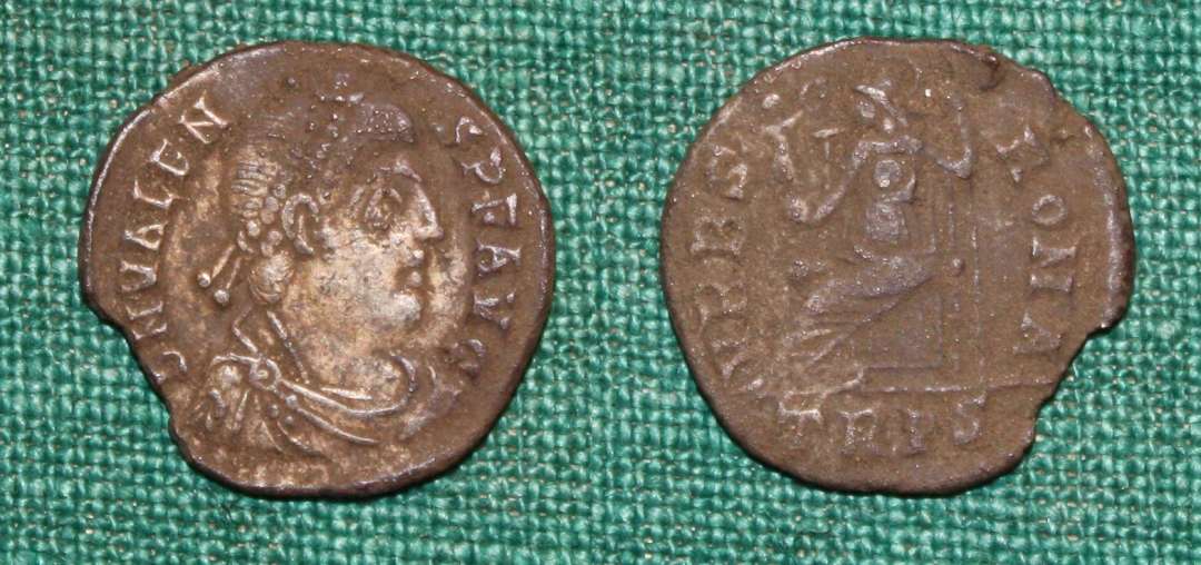 Romersk, Siliqua - sølvmønt fra Kejser Valens 374-377. Valens/Urbs Roma siddende mod venstre på tronstol. Holder lille Viktoria i hånden.