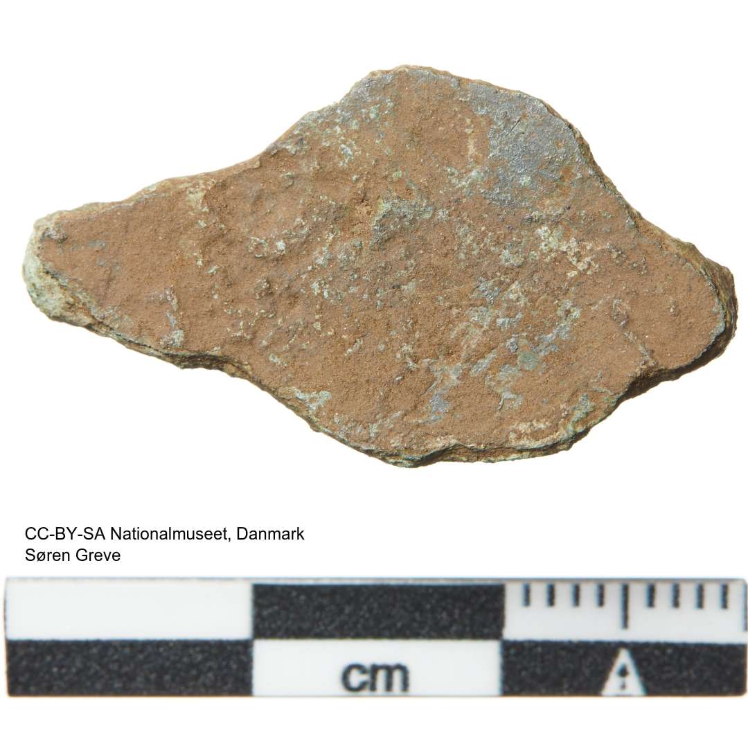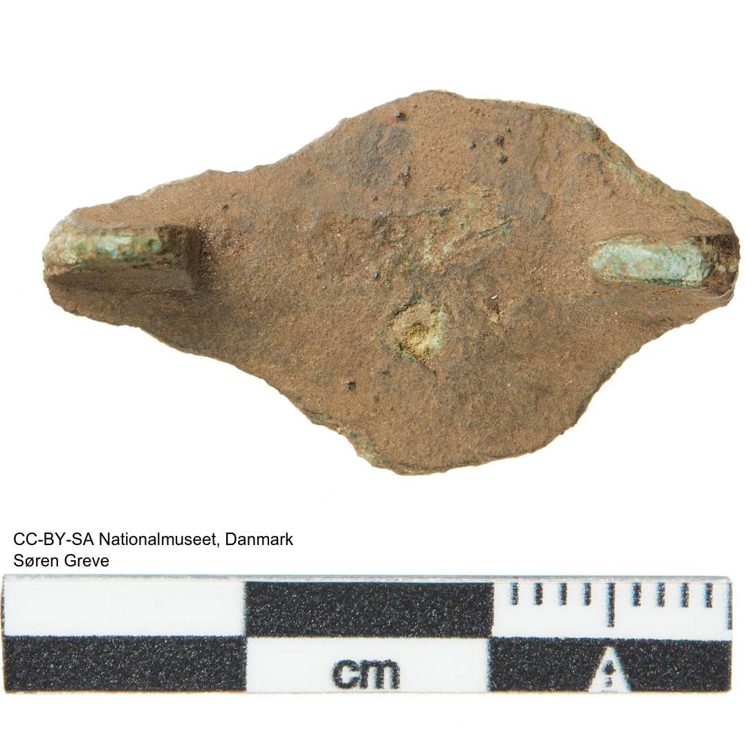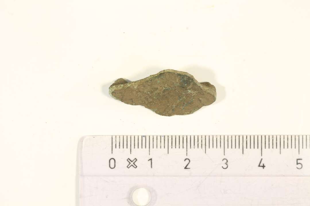 Fragment af fibel. Spidsoval plade med rest af nålefæste bagpå.  Ornamentik bortslidt/ikke synlig. Mål: 2,8x1,5 cm.