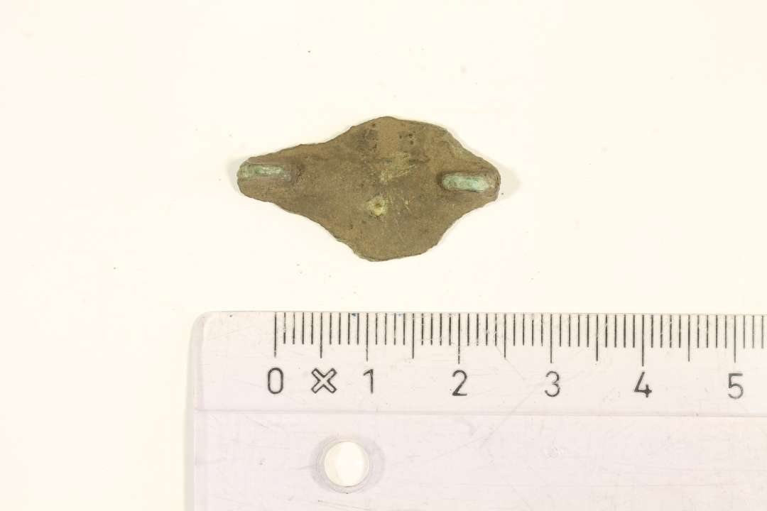 Fragment af formentlig 6-kantet pladefibula (Ørsnes H2). Overfladen er nedbrudt og der kan ikke erkendes ornamentik.På bagsiden rester af nåleholder og -fæste.