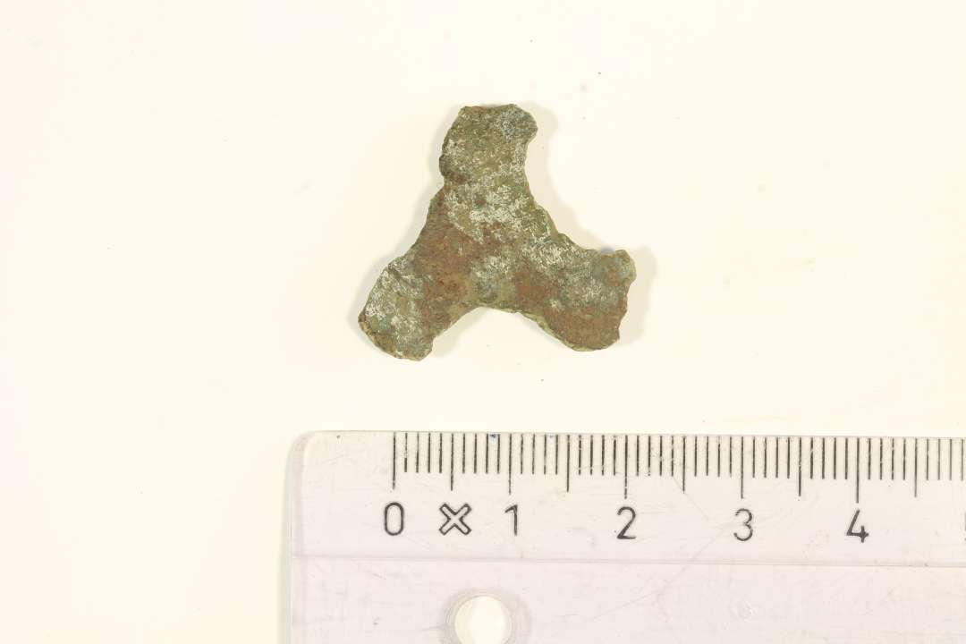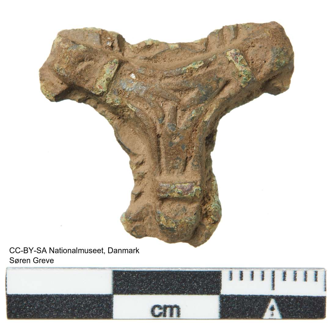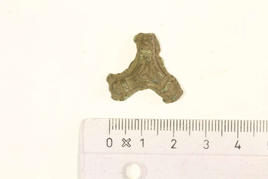 Formodet midterdel af trefliget spænde. Trearmet, plastiks dekoration med dyrehoveder? i enderne. Tydeligvis afbrækket hele vejen rundt. Mål: 2,2x2,2x2,2 cm., glat bagside