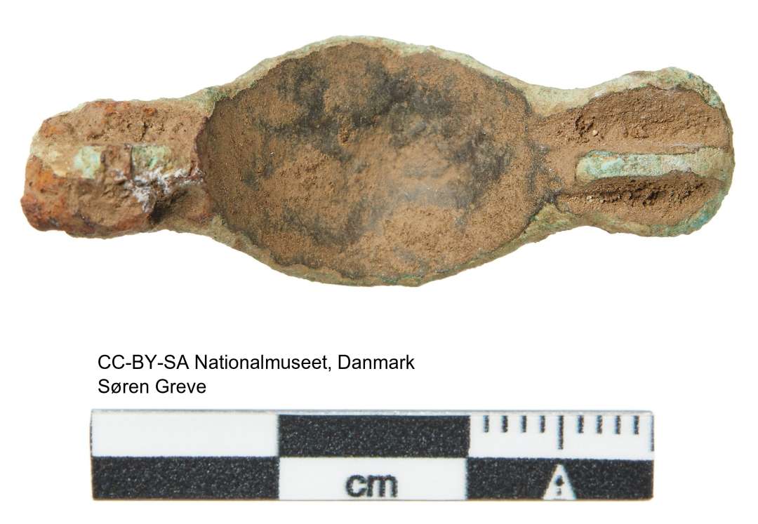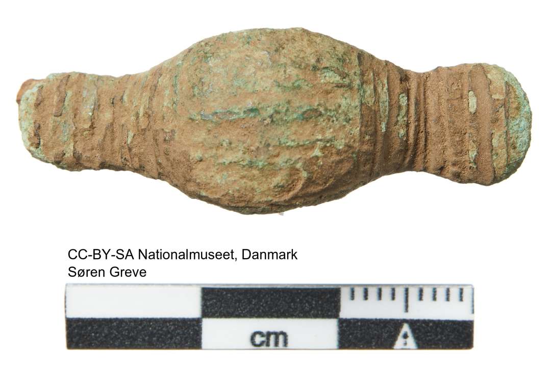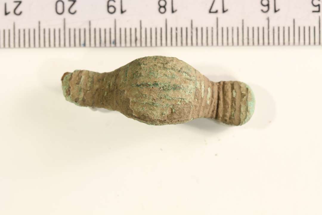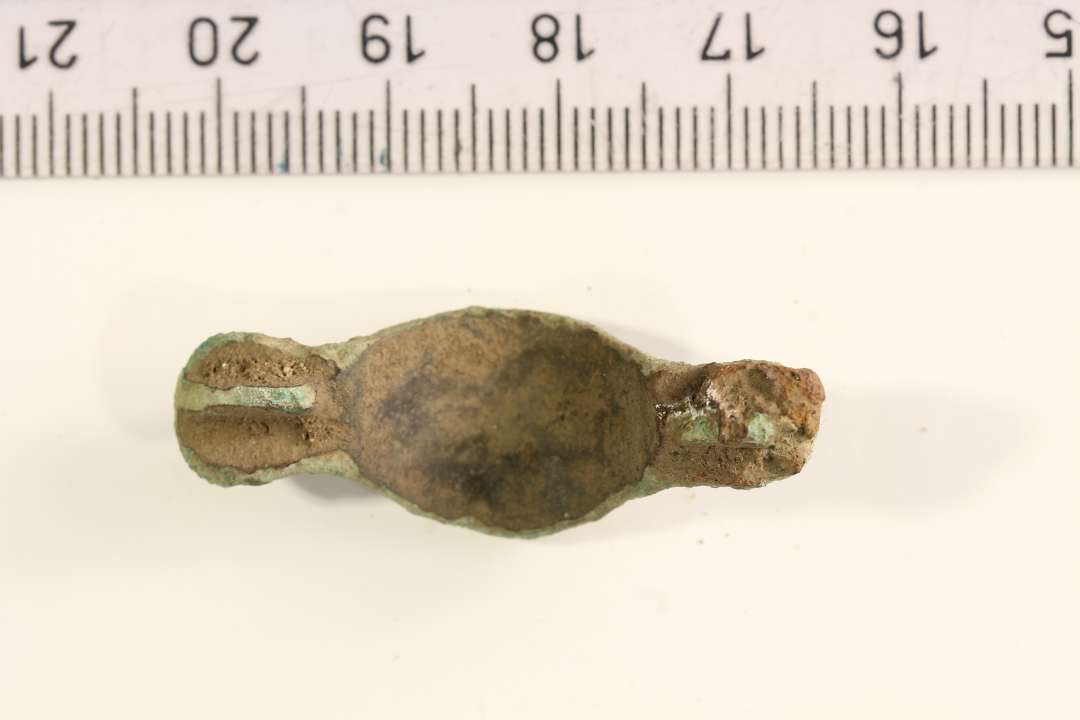 Kort ligearmet fibel. Dekoration med tværrifling. Længde: 3,8 cm.