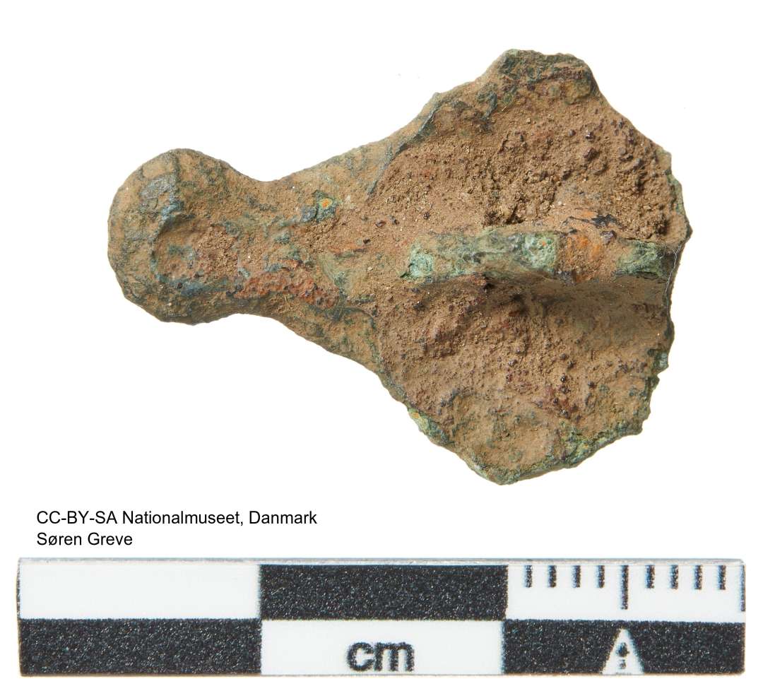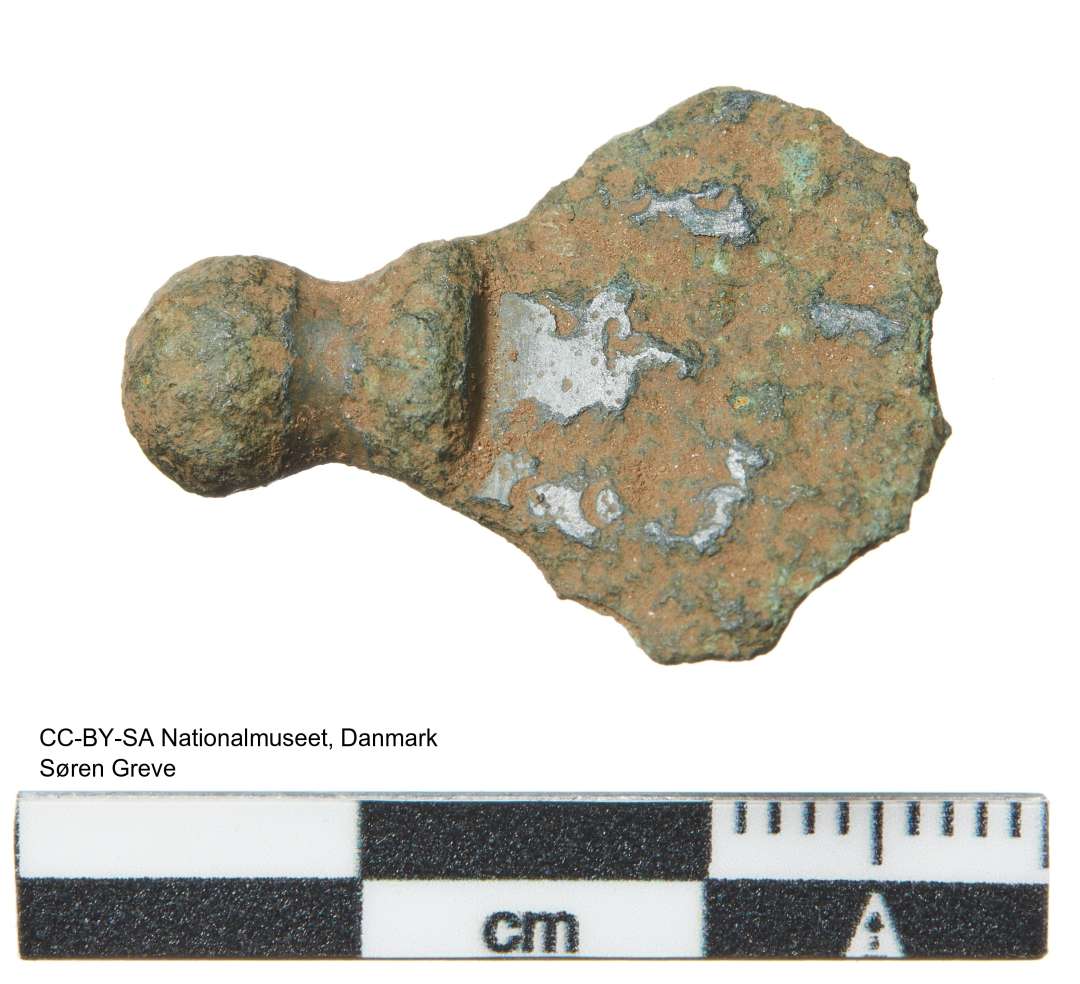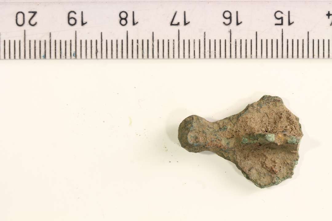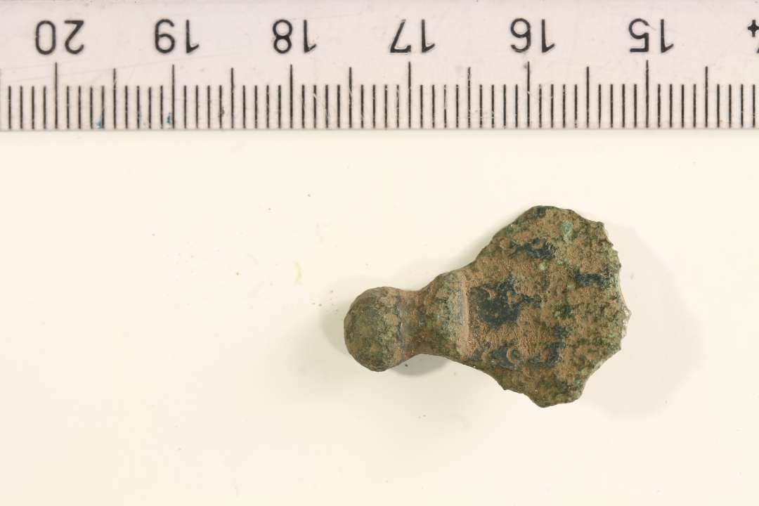 Fragment af korsformet fibel. Med profileret knop og rest af nålefæste bagpå. største mål: 2,5 cm.