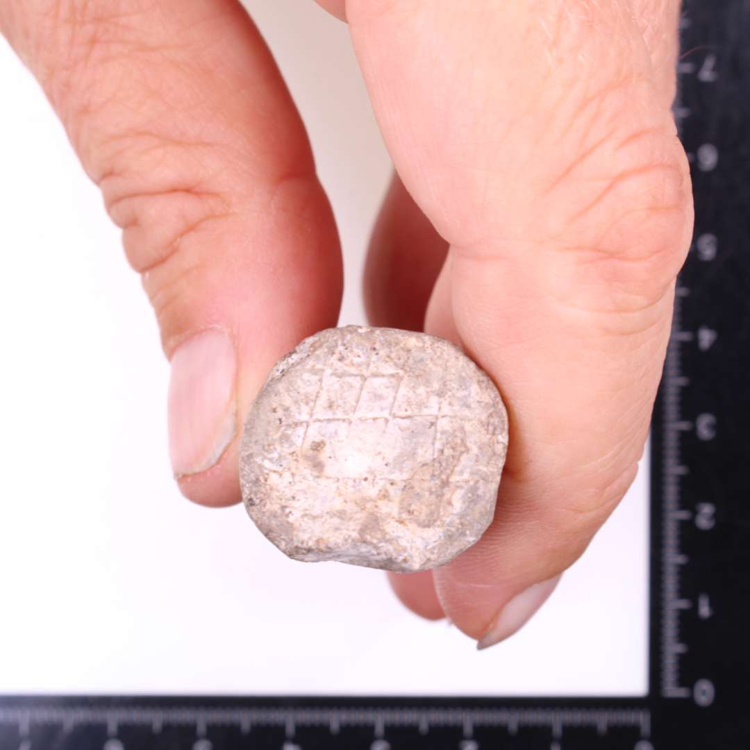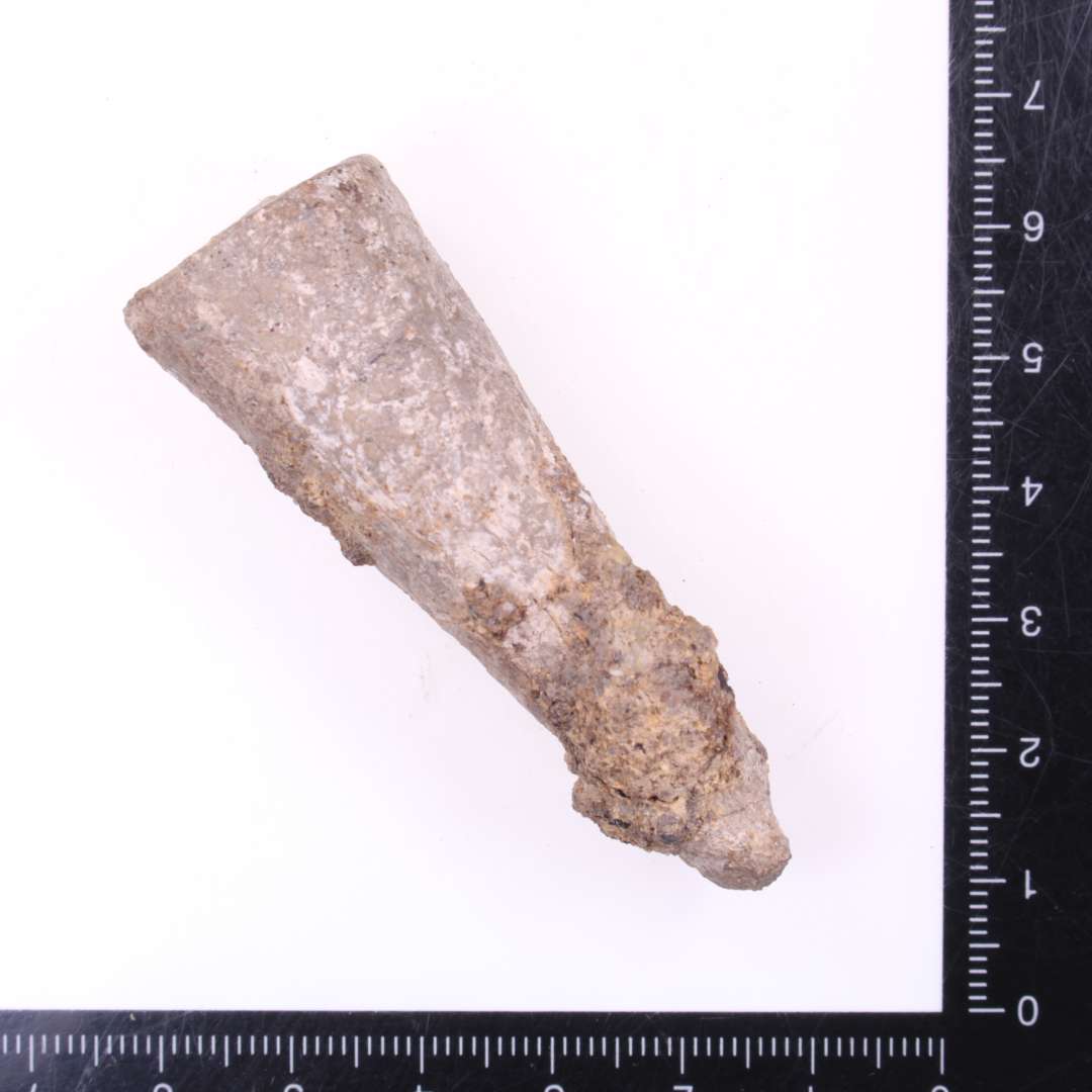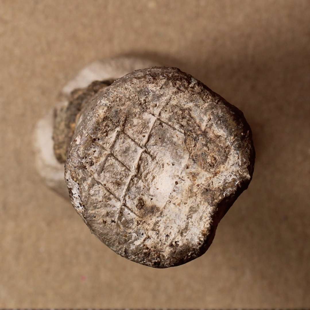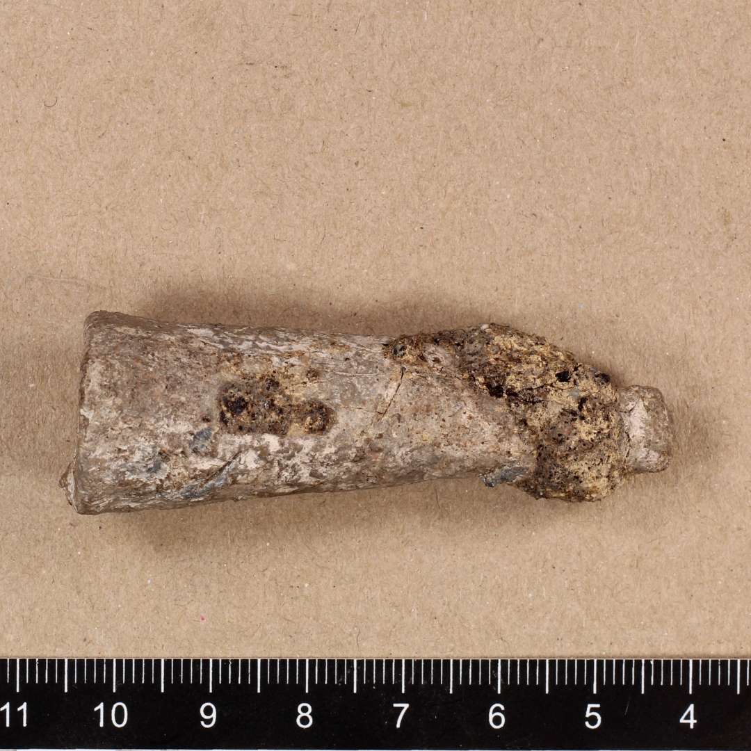6 cm lang konisk blygenstand med lidt korrodering på siden. Harlekinsmønster i bunden. Lille slidt eller indtrykt fordybning i bund. Vægtlod? (100g).