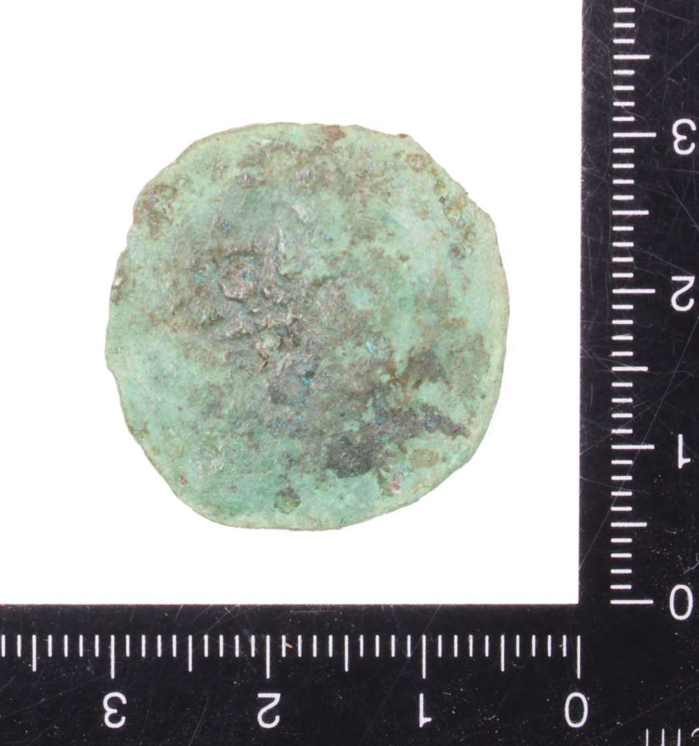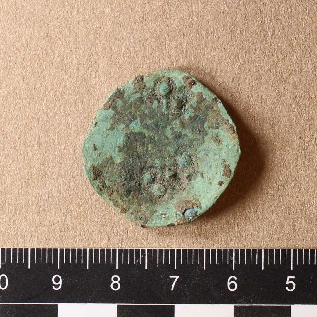 Rund blanket af kobberlegering. Ca. 2,5 cm i dia og 2 mm tyk. Let bøjet. På den ene side er et svagt præg med små runde forbundne prikker - muligvis i tillempet korsform eller blad/ranke motiv.